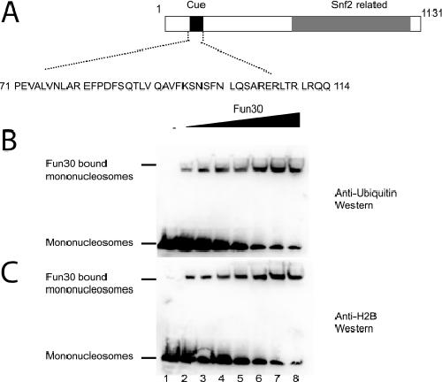 FIGURE 7. Fun30 contains a CUE motif, but no specific interaction with ubiquitinylated histones can be detected. A, schematic representation of CUE domain location within Fun30. A native gel in which ∼200 nm HeLa mononucleosomes were incubated with increased quantities of Fun30 (∼5–320 nm, lanes 2–8) was transferred to a polyvinylidene difluoride membrane. B, the transfer of ubiquitinylated histones was monitored by Western blotting using an anti-ubiquitin antibody. C, Western blotting to detect the transfer of total H2B. No difference in the efficiency with which ubiquitinylated or total H2B is transferred could be detected.
