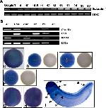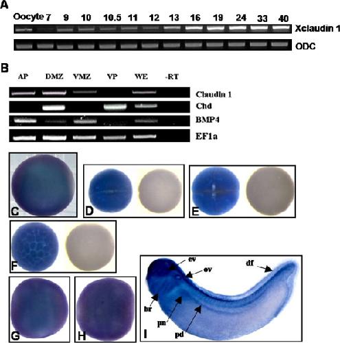Temporal and spatial expression pattern of Xclaudin 1 during Xenopus development. (A) Temporal expression pattern of Xclaudin 1 was detected by RT-PCR. Ornithine decarboxylase (ODC) primers were used to normalize the amount of cDNA template. (B) RT-PCR of gastrula stage embryos (st.10.5). Xclaudin 1 mRNA is enriched in animal pole region and dorsal marginal zone in embryos. Chd (chordin) and BMP 4 were used as each gene control of explanted tissue and EF1α also used as a loading control. (CâJ) In situ hybridization of spatial expression of Xclaudin 1 during early Xenopus development. Whole-mount in situ hybridization was carried out using a digoxigenin-labeled riboprobe. (C) Oocyte, animal view. (D) 2-cell stage, animal view and vegetal view. (E) 4-cell stage, animal view and vegetal view. (F) One hundred and twenty-eight cell stage, animal view and vegetal view. (G) Gastrular stage, animal view. (H) Neurula stage, animal view. (I) stage 29/30 lateral view. pd, pronephric duct; pn, pronephrus; ov, optic vesicle; df, dorsal fin; ev, eye vesicle; br, branchial arch.