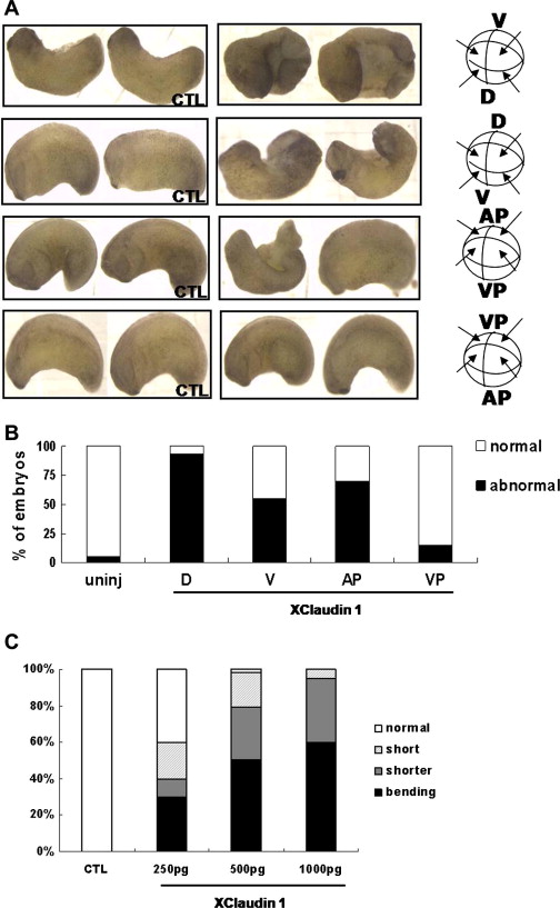 Gastrulation defects from over-expression of Xclaudin 1. (A) Injection of Xclaudin 1 mRNA 500 pg/embryo (n = 63) into designated blastomeres at 8-cell stage resulted in embryos with dorsally bent trunk and shorter or short anteroposterior axis in a dose-dependent manner. (B) Injection of Xclaudin 1 mRNA (500 pg/embryo) at four blastomeres of dorsal (n = 70), ventral (n = 65), animal (n = 68) or vegetal side (n = 65) of 8-cell stage embryos. The embryos were observed and analyzed at stage 23. (C) Morphology of embryos injected with various doses of Xclaudin 1 mRNA (250 pg/embryo (n = 58), 500 pg/embryo (n = 63) or 1 ng/embryo (n = 60)) and un-injected embryos (n = 67) was analyzed according to category of phenotypes. Numbers of embryos represents the percentage of embryos with normal morphology (open bar), a short (slanting line bar), shorter (gray solid bar), anteroposterior and dorsally curved trunk axis (black solid bar) out of total embryos examined.