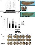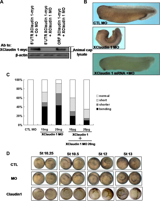 Gastrulation defects from inhibition of Xclaudin 1. (A) Verification of Xclaudin 1 MO in translation blocking efficiency by using Western blotting co-injection of Xclaudin 1 MO (20 ng) completely blocked the translation of co-injected Xclaudin 1 mRNA (500 pg/embryo) that bears MO-targeted 5â²-UTR sequence, but not the one that misses MO-targeted sequence (500 pg/embryo) but bears only the whole coding region. Animal cap explant lysates from early gastrula stages following 2-cell stage injection at animal pole region were used for immunoblot (IB) analysis with anti-myc antibodies. β-Actin served as a loading control. (B) Four blastomeres at 8-cell stage embryos were injected at the dorso-animal blastomeres with Xclaudin 1 MO (20 ng). Unlike control embryos injected with control MO embryos (n = 70), embryos injected with Xclaudin 1 MO (n = 65) displayed slightly opened neural folds, dorsally bending trunk and shortened axis. These phenotypes were rescued by co-injection of Xclaudin 1 mRNA (ORF Xclaudin 1-myc) and MO (n = 67). (C) Gastrulation defects caused by Xclaudin 1 MO were rescued distinctively by the co-injection of Xclaudin 1 mRNA. The number of rescued embryos was increased when 20 pg of Xclaudin mRNA (n = 58) was injected from that with 10 pg (n = 54). Graph of numbers of embryos, which showed normal embryo (open bar), a short (slanting line bar), shorter (gray solid bar) anteroposterior and dorsally bending trunk axis (black solid bar) in injection of Xclaudin 1 mRNAs. (D) Xclaudin 1 knockdown retarded blastopore closure (n = 72). Frames from a representative time-lapse sequence showed that blastopore closure was delayed in either Xclaudin 1 MO (20 ng)- or mRNA-injected embryos until sibling control embryos reach equivalent midgastrula stage 13.
