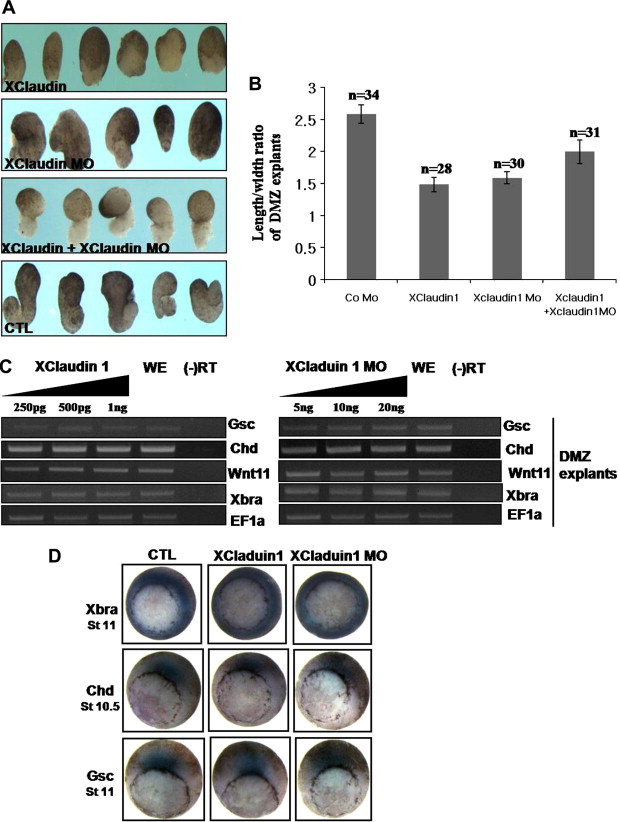 Injection of embryos with either Xclaudin 1 MO or mRNA inhibits convergent extension movements. (A) Two dorsal blastomeres of 4-cell stage embryos, onto their equatorial region were injected with the Xclaudin 1 mRNA (500 pg; n = 28) or the Xclaudin 1 MO (20 ng; n = 30) separately, or together (mRNA, 250 pg, MO, 20 ng; n = 31). Dorsal marginal zone was dissected at early gastrula (st.10.5) and then cultured until stage 18. The elongation of explants was inhibited by injection with either Xclaudin 1 mRNA or Xclaudin 1 MO. The inhibition was partially rescued by co-injection of Xclaudin 1 mRNA. (B) We measured length/width ratio of injected DMZ explants in DMZ elongation assay. n, total number of explants. Error bars indicate means ± SD. (C) RT-PCR analysis showed that injection with either Xclaudin 1 mRNA (250 pg, 500 pg and 1 ng), or Xclaudin 1 MO (5, 10 and 20 ng) do not affect organizer cell fate specification from DMZ explants tissues. The expression of Chd, Gsc, Wnt11 and Xbra was analyzed using primers specific for them. EF1α is a loading control. (â) RT, minus reverse transcription; controls sample. (D) Whole-mount in situ hybridization analysis was performed after injection of either Xclaudin 1 mRNA (1 ng/embryo) or MO (40 ng/embryo) into equatorial regions of two blastomeres at 2-cell stage. Mesodermal marker Xbra and dorsal mesodermal genes Chd and Gsc were used in WISH. Neither Xclaudin 1 mRNA nor Xclaudin 1 MO changed the expression of the mesodermal fate markers.