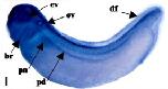 cldn1 (claudin 1) gene expression in Xenopus laevis embryo, assayed via in situ hybridization, NF stage 29 and 30, lateral view, anteriorleft, dorsal up.