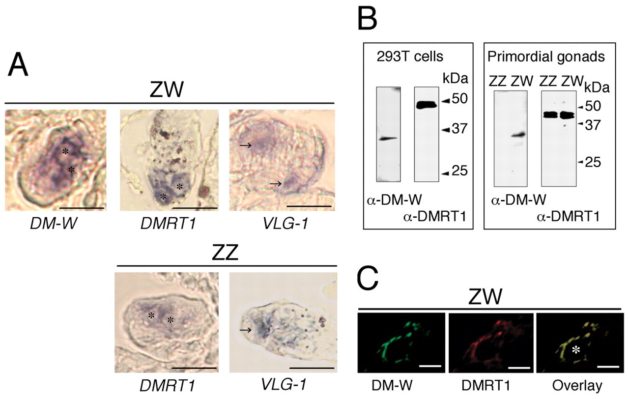 Fig. 1. Colocalization of the DM-W and DMRT1 proteins in somatic cells surrounding the PGCs of the ZW gonad at stage 50. (A) In situ hybridization analyses of DM-W, DMRT1 and XVLG-1 in cross-sections of primordial ZW (upper) or ZZ (lower) gonads at stage 50. Asterisks indicate primordial germ cells (PGCs). Scale bars: 5 μm. (B) Western blot analysis using the anti-DM-W and anti-DMRT1 antibodies. 293T cells were transiently transfected with pcDNA3-FLAG-DM-W or pcDNA3-FLAG-DMRT1. The extracts of the 293 cells (left) and primordial ZZ and ZW gonads (stages 50-52) (right) were examined by immunoblotting with each antibody followed by an HRP-conjugated anti-rabbit antibody. DM-W was only detected in the ZW samples. (C) Immunofluorescence analysis using anti-DM-W and anti-DMRT1 antibodies on cross-sections of primordial ZW gonads at stage 50. Scale bars: 2 μm. Asterisk indicates a PGC.