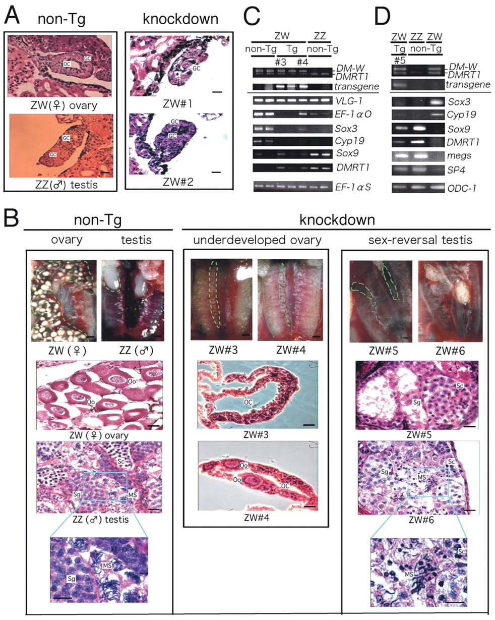 Fig. 3. Analyses of transgenic X. laevis individuals carrying the knockdown vector for DM-W. (A) Sections of ovarian gonads from two non-transgenic and two transgenic (knockdown) ZW tadpoles carrying psh-DM-W1 and -W2, at stage 56. GC, germ cell; OC, ovarian cavity. Scale bars: 20 μm. (B) Non-transgenic normal gonads (left), and underdeveloped ovaries (middle) and testicular gonads (right) of transgenic ZW frogs six months after metamorphosis. The gonad is within the dotted line. MS, mature sperm; OC, ovarian cavity; Oo, oocyte; Sc, spermatocyte; Sg, spermatogonium. Scale bars: 0.5 mm (upper); 20 μm (middle and lower). (C,D) RT-PCR of gonadal marker genes in normal ZW ovary, ZZ testis and transgenic ZW (#3-#5) gonads. ZW#3-#5 correspond to the individual animals in B. Genomic PCRs for the transgene insertion and genetic sex are shown in the upper two panels. The data in C and D are from two or one non-transgenic ZZ and ZW individuals, and three or one transgenic ZW individuals. The marker genes were as follows. VLG-1, germ cells; EF-1O, oocytes; Sox3 and P450cArom, ovary-specific cells; DMRT1 and Sox9, testis-specific cells; megs and SP4, spermatogenic cells; ODC-1 and EF-1S, control.