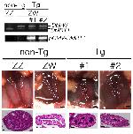 Fig. 4. Analysis of transgenic ZW frogs carrying an expression vector for DMRT1. Non-transgenic normal ZZ and ZW gonads (left), and transgenic ovotestis (middle and right) carrying pcDNA3-FLAG-DMRT1, 1 month after metamorphosis, are shown. Genomic PCRs for transgene insertion and genetic sex are shown in the upper two panels. The gonad is inside the dotted line. The asterisks indicate germ cells. Scale bars: 0.5 mm (upper); 20 μm (lower).