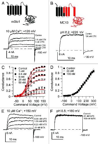 Figure 1. Slo3 is insensitive to block by CTX and IbTX. In (A), traces show block by cumulative application of CTX to an outside-out patch, with currents activated with 10 um Ca2+ at +120 mV. Cartoon on the top diagrams the Slo1 topology showing transmembrane segments and the cytosolic domain. In (B), 100 nM CTX is without effect on currents through the Slo3 surrogate construct, MC13. Currents were activated with a pipette saline of pH 8.2 with a depolarizing voltage step to +220 mV. The cartoon shows the MC13 topology with red elements originating from Slo3 and black elements from Slo1. See Methods for precise segment boundaries. In (C), Slo1 G/V curves are shown for different CTX concentrations. Red lines correspond to a fit of a state-independent blocking scheme (Scheme 2a) with Kb = 6.1 ± 0.3 nM and no voltage-dependence during the time of each voltage-step. In (D), the effect of 20 and 100 nM CTX on MC13 G/V curves is shown. In (E), traces shown Slo1 currents during progressive increases in IbTX concentration to an outside-out patch with 10 μM pipette Ca2+ and activation steps to +150 mV. For comparison to other studies, fitting the fractional block of current by IbTX for values at +40 mV with a Hill equation yields a Kd = 0.5 ± 0.3 nM (nH = 1). In (F), MC13 currents are insensitive to application of 25 and 100 nM IbTX to an outside-out patch (activation with pipette pH of 8.5 at +180 mV).