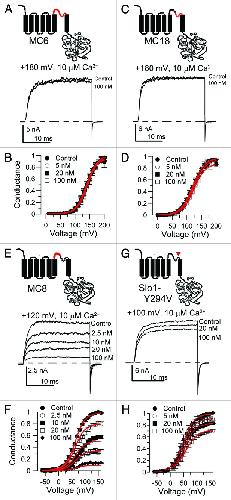 Figure 2. Slo1 CTX sensitivity arises primarily from Y294 with small contributions from other elements in the turret segment. In (A), traces show the lack of effect of 100 nM CTX on currents through construct MC6 (inset), in which the Slo1 P-loop is replaced with Slo3 sequence. In (B), G/V curves for MC6 activated with 10 μM Ca2+ are shown in the absence and presence of CTX. Red lines correspond to fits of a simple Boltzman function. In (C), traces show the lack of effect of 100 nM CTX on construct MC18, in which the 2nd half of the P-loop (selectivity filter and pore helix) were replaced with Slo3 sequence. In (D), G/V curves for the MC18 construct activated with 10 μM Ca2+ are shown. In (E), traces show that CTX readily blocks currents through construct MC8, in which the first half of the P-loop (primarily presumed turrent sequence) was replaced with Slo3 sequence. In (F), G/V curves for MC8 activated with 10 μM Ca2+ are shown at different CTX concentrations. Red lines correspond to the best fit of a state-independent blocking model (Scheme 2) with Kb = 10.4 ± 0.3 nM. In (G), traces show weak blocking effects of CTX on currents through Slo1-Y294V. In (H), effects of CTX on the Slo1-Y294V G/V curves are plotted for 10 μM Ca2+.