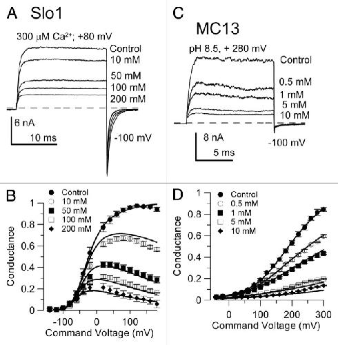 Figure 4. MC13 is more sensitive than Slo1 to block by cytosolic TEA. In (A), traces show Slo1 current activated at +80 mV with 300 μM Ca2+ in the indicated concentrations of cytosolic TEA. In (B), G/V curves are shown for set of 4–5 patches with the lines showing the best fit of an open channel blocking model (Kb = 49.0 ± 3.2 μM; zδ = -0.15 ± 0.02 e). In (C), traces show MC13 currents activated with pH 8.5 at +280 mV at the indicated cytosolic TEA concentrations. In (D), G/V curves are shown for a set of 6 patches with the lines showing the best fit of an open channel block model (Kb = 0.11 ± 0.01 μM; zδ = 0.12 ± 0.01 e, with the maximal fractional conductance at +300 mV assumed to be 0.35,5,6). A state-independent model did not fit as well (see text and Suppl. Fig. 3).
