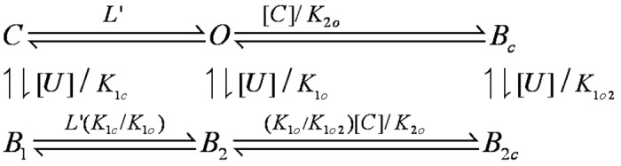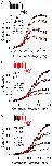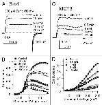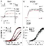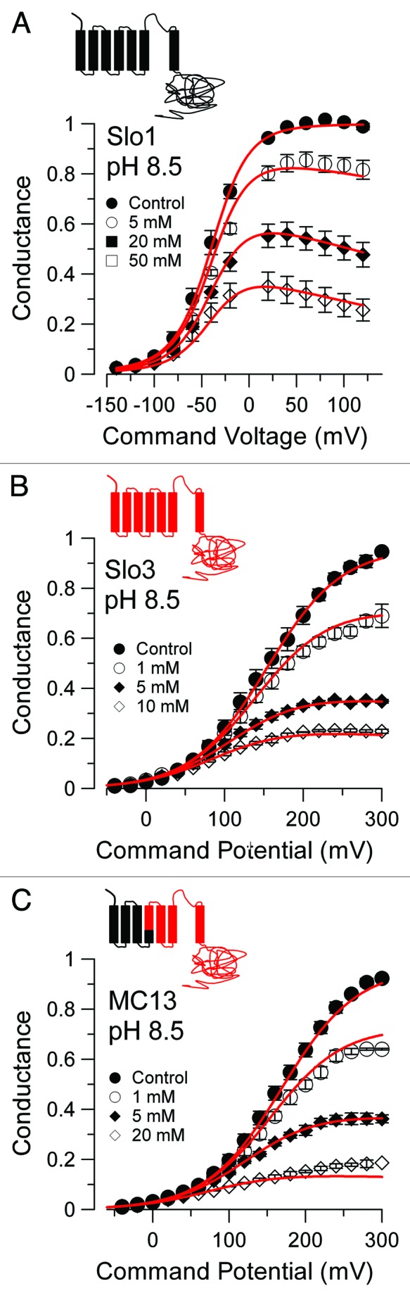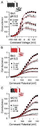 Figure 6. Cytosolic 4-AP blocks Slo3/MC13 more effectively than it blocks Slo1. In (A), G/V curves were generated for Slo1 currents activated with 300 μM Ca2+ (pH 8.5) in inside-out patches with various concentrations of 4-AP. Red lines are the best fit of Scheme 2a, the state-independent block model, with Kb = 30.7 ± 1.3 mM with zδ = 0.1 ± 0.02 e. In (B), G/V curves were generated for Slo3 currents activated with pH 8.5 and fit with Scheme 1, the open channel block model (Kb = 2.5 ± 0.5 mM with zδ = 0.02 ± 0.03 e. In (C), G/V curves were generated for MC13 currents activated in inside-out patches with pH 8.5 and fit with Scheme 1 (Kb = 2.1 ± 0.2 with zδ = 0.02 ± 0.01 e).