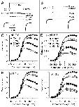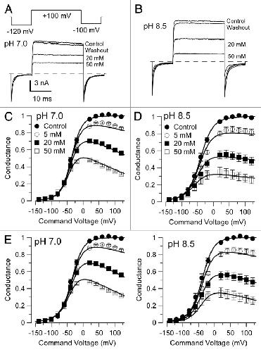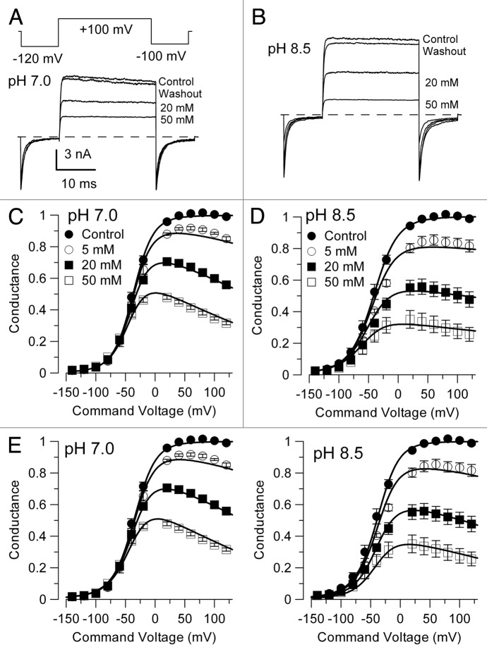 Figure 7. Comparison of block of BK currents by 4-AP at pH 7.0 and 8.5. In (A), currents activated with 300 μM Ca2+ at +100 mV by the indicated voltage protocol are compared for different 4-AP concentrations at pH 7.0. The trace for 50 mM 4-AP exhibits greater than 50% block at +100 mV with almost full and instantaneous recovery during the tail current at -100 mV. In (B), currents from the same patch as in (A) were activated as in (A) except at pH 8.5. The trace at 50 mM 4-AP shows strong block at +100 mV, with less complete recovery from block during the tail current in comparison to currents at pH 7.0. In (C and D), G-V curves at plotted for different concentrations of 4-AP either for pH 7.0 (C) or 8.5 (D). In (C), lines correspond to the best fit of Scheme 1a to all points for pH 7.0 yielding Kb = 58.3 ± 3.3 mM with zδ = 0.18 ± 0.02 e. In (D), similarly for pH 8.5, Scheme 1a yielded Kbo = 24.9 ± 2.6 mM with zδ = 0.05 ± 0.06 e. However, at pH 8.5, the state-independent Scheme 2a yielded a better fit than Scheme 1a, with Kbo= Kbc = 31.0 ± 2.7 mM with zδ = 0.11 ± 0.03 e, while for pH 7.0 Scheme 2a yielded a poorer fit than Scheme 1a. In (E), the G/V curves obtained at both pH 7.0 (left) and pH 8.5 (right) were fit simultaneously with Scheme 3, which assumes two independent 4-AP blocking sites, one for the uncharged non-protonated species defined by binding constant Kb(u) and a voltage-dependent site sensitive to protonated 4-AP defined by binding constant Kb(p). Best fit values for the three free parameters were Kb(u) = 9.07 ± 0.46 mM, Kb(p) = 63.5 ± 3.8 mM, and z(p) = 0.19 ± 0.02 e.