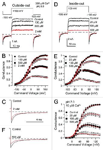 Figure 8. Block of Slo1 by extracellular or intracellular quinidine is increased by depolarization. In (A), the indicated voltage-protocol was used to elicit Slo1 currents activated with a cytosolic solution containing 300 μM Ca2+ at pH 8.5. Each trace was with a different concentration of extracellular quinidine (pH 7.0). In (B), G/V curves for Slo1 current activation in the presence and absence of quinidine exhibit increased block at more positive potentials. Red lines correspond to the fit of Eqn. 1 with Kb(0) = 0.95 ± 0.02 mM (zδ = 0.05 + 0.01 e). In (C), tail currents following repolarization are shown on an expanded time base for the control trace and 2 mM quinidine trace (red) from (A), revealing rapid unblock upon repolariztion. In (D), traces show Slo1 currents in an inside-out patch activated with the indicated voltage-protocol with 300 μM cytosolic Ca2+ at pH 8.5 and the indicated quinidine concentrations. In (E), G/V curves for Slo1 currents with various quinidine concentrations are plotted along with a fit of Scheme 1, an open-channel block model, with Kb(0) = 142.9 + 3.4 μM (zδ = 0.18 ± 0.01 e). In F, traces are tail currents from (D) for control and 500 μM quinidine solutions. The fractional reduction of peak instantaneous current at -100 mV is reduced relative to the fractional reduction of steady-state current at +100 mV. In (G), Slo1 G/V curves were generated from inside-out patches with 10 μM Ca2+ at pH 7.0 and the indicated quinidine concentrations with the best fit of Eqn. 1 yielding Kb(0) = 92.8 ± 9.8 μM with zδ = 0.11 ± 0.03 e.
