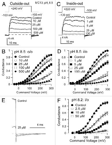 Figure 9. Block of MC13 by either extracellular or intracellular quinidine shows a similar relief with depolarization. In (A), MC13 currents were activated in an outside-out patch with the indicated voltage-protocol with a pipette saline of pH 8.5. Quinidine (pH 7.0) was applied to the extracellular side of the patch. In (B), G/V curves for MC13 currents activated in various quinidine concentrations show relief of block at more positive potentials, particularly at higher quinidine concentrations. Lines correspond to a fit of Eqn. 2 (Scheme 2a; state-independent channel block) with Kb = 11.42 ± 1.44 μM (zδ = 0.13 ± 0.01 e from the outside). In (C), traces show MC13 currents activated in an inside-out patch at pH 8.5 with the indicated quinidine concentrations. In (D), G/V curves from MC13 currents are plotted for the indicated quinidine concentrations. Lines show the best fit with Scheme 2a, a state-independent blocking model, with Kb = 1.97 ± 0.34 μM with zδ = 0.13 ± 0.02 e. In (E), traces are tail currents from (C) for control and 25 μM quinidine solutions, highlighting persistence of block with repolarization. In (F), G/V curves for MC13 currents obtained in inside-out patches at pH 8.2 with various quinidine concentrations are shown, with the best fit (Eqn. 2) yielding Kb(0) = 0.98 ± 0.03 μM, with zδ constrained to 0.13 e.