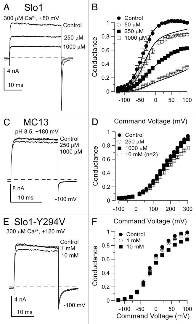 Figure 3. The Slo3 surrogate, MC13, is relatively insensitive to block by extracellular TEA in comparison to Slo1. In (A), application of TEA to outside-out patches inhibits Slo1 current. In (B), the effect of TEA on the Slo1 G/V curve generated with 300 μM pipette Ca2+ is shown. The solid lines are the best fit of a state-independent blocking model (Kb = 173.9 ± 8.0 μM; zδ = 0.23 ± 0.02 e). Block is relieved with depolarization. In (C), traces show weak blocking effects of extracellular TEA on MC13 currents in outside-out patches. In (D), extracellular TEA has minimal effect on MC13 G/V curves. In (E), mutation of Y294V in Slo1 abolishes most of the sensitivity of Slo1 to TEA. In (F), G/V curves summarize the lack of effect of TEA on the Slo1-Y294V construct.