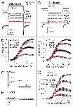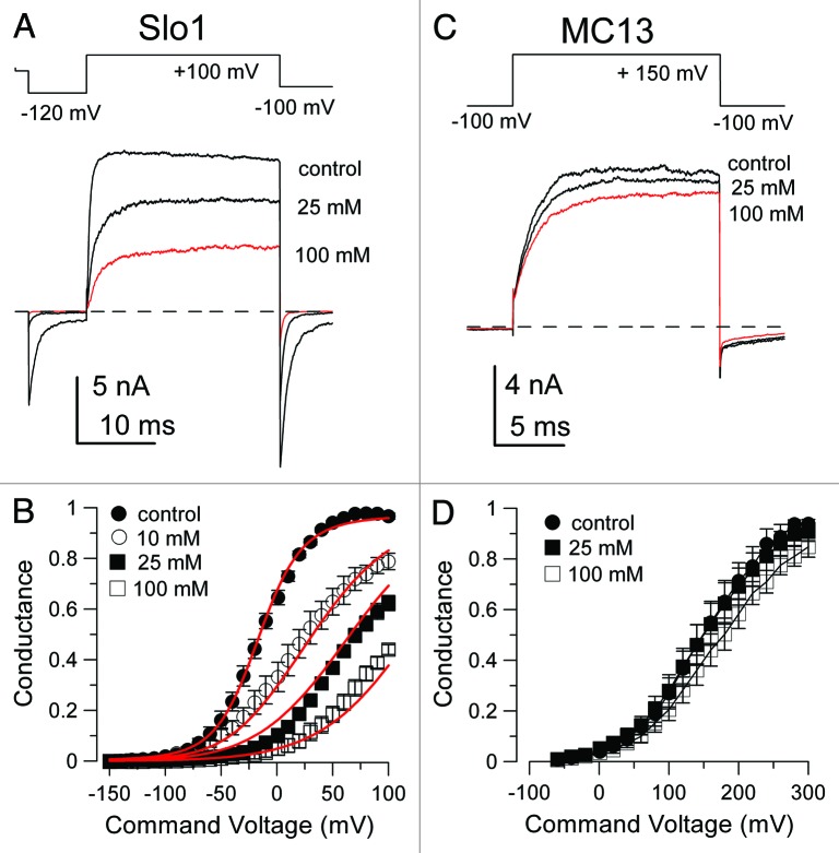 Figure 5. MC13 is relatively insensitive to block by extracellular 4-AP compared to block of Slo1. In (A), Slo1 currents were activated in outside-out patches by the indicated voltage-protocol with 300 μM Ca2+ (pH 8.5) inside the recording pipette. Application of 25 and 100 mM 4-AP resulted in substantial block of outward BK current. In the presence of 4-AP, activation at +100 mV is noticeably slowed, consistent with time-dependent unblock. In contrast, tail currents at -100 mV (red trace) in the presence of 4-AP decay more rapidly than in the absence of 4-AP and exhibit more block at the negative potentials. The pH of the extracellular solution was 7.0. In (B), G/V curves from traces such as those in (A) were generated from steady-state currents. Red lines are the best fit of the open channel block scheme with Kb(0) = 5.19 ± 0.41 mM and zδ = 0.60 ± 0.03 e, consistent with a relief from block at more positive cytosolic voltages. In (C), MC13 currents were activated by the indicated voltage-protocol with the pipette solution at pH 8.5. 4-AP was much less effective in blocking MC13 than BK currents. In (D), G-V curves for MC13 currents were generated again revealing the relative lack of effect of extracellular 4-AP on MC13.