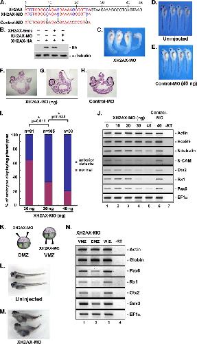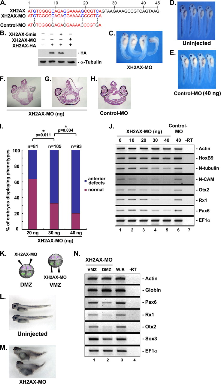 Depletion of XH2AX causes defective anterior neural formation. Control-MO or XH2AX-MO was injected at the one- or two-cell stage in the animal pole region, and embryos were cultured until the tadpole stage. A, the MO sequence targeting XH2AX. B, XH2AX-MO (30 ng) specifically knocked down the translation of the overexpressed C-terminal HA-tagged histone H2AX protein. α-Tubulin served as a specificity control. C, phenotypes of XH2AX-depleted embryos. D, β-gal mRNA (200 pg)-injected embryos were used as a control phenotype. E, injection of Control-MO did not result in severe defects. FâH, hematoxylin-stained transverse section of the head region of tadpole embryos from Type A (F and G) or Control-MO (H). I, quantitative results of relative defects in whole embryos. *, p < 0.05. J, RT-PCR analysis of whole embryos expressing XH2AX-MO. XH2AX-MO caused repression of anterior neural markers (Otx2, Rx1, and Pax6), the pan-neural marker (N-CAM), and the neural differentiation marker (N-tubulin) without changing the mesoderm marker actin and the posterior marker HoxB9. Control-MO did not change the anterior neural markers tested above. K, XH2AX-MO (20 ng) was injected into the DMZ or VMZ of four-cell stage embryos. L, ventrally XH2AX-MO-injected embryos showed a normal phenotype. M, dorsally injected XH2AX-MO caused a weak head defect with small eyes and shortened axis. N, RT-PCR analysis of whole embryos dorsally or ventrally expressing XH2AX-MO. Dorsally (but not ventrally) expressed XH2AX-MO repressed anterior neural markers, including neural markers, but not the actin and globin mesoderm markers, compared with the whole embryo (W.E.) that was not injected. âRT, control reaction without reverse transcriptase.