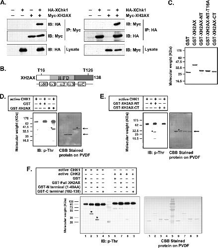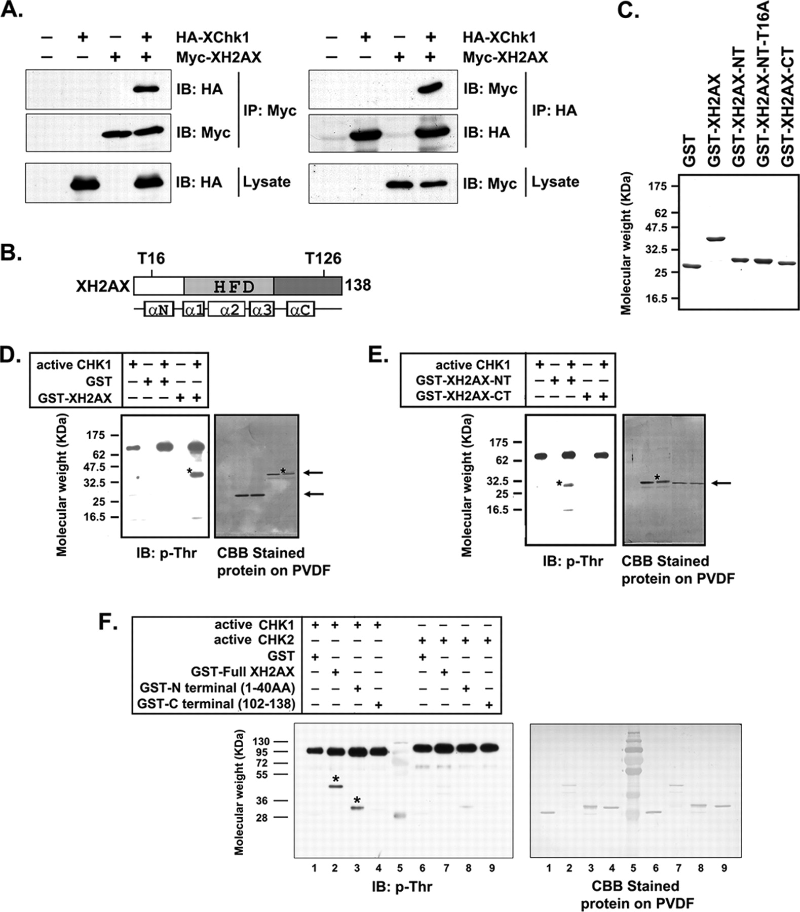 XH2AX is phosphorylated by Chk1 at Thr16 of the N terminus. A, in vivo interaction between XH2AX and Chk1. Lysates from embryos injected with mRNAs for HA-tagged Xenopus Chk1 and Myc-tagged XH2AX expression were used to immunoprecipitate (IP) Myc-XH2AX (left panels) or HA-Xenopus Chk1 (right panels). IB, immunoblot. B, schematic representation of the structure of XH2AX. The histone fold domain (HFD) is a globular domain comprising the nucleosome core. αN, α-helix of the N-terminal tail; αC, α-helix of the C-terminal tail. C, Coomassie Brilliant Blue (CBB) staining of a bacterially expressed GST-XH2AX deletion mutant. DâG, Western blot using an anti-phosphothreonine antibody after an in vitro kinase reaction. D, Chk1 phosphorylated a threonine residue of XH2AX. E, Chk1 phosphorylated a threonine residue in the N terminus (but not the C terminus) of XH2AX. F, Chk1 phosphorylated a threonine residue in the N terminus of XH2AX (*), whereas Chk2 had little effect. G, phosphorylation of a threonine residue in the N terminus of XH2AX (*) was absent when Thr16 was mutated to alanine. HâJ, Western blot using anti-phospho-Thr16 XH2AX antibody after an in vitro kinase reaction. H, anti-phospho-Thr16 XH2AX antibody was used for detecting phosphorylation of XH2AX. The upper arrow indicates full-length GST-XH2AX, and the lower arrow indicates the N terminus of GST-XH2AX. Asterisks indicate phosphorylation of full-length XH2AX and its N terminus. I, phosphorylation of XH2AX at Thr16 by Chk1 is shown by an in vitro kinase assay using immunoprecipitated FLAG-tagged Chk1. Extracts from embryos injected or uninjected (control) with FLAG-Chk1 mRNA were immunoprecipitated using an anti-FLAG antibody, and the kinase reaction was performed with the indicated GST-recombinant protein as a substrate. Phosphorylation of the threonine residue was analyzed by Western blotting using anti-phospho-Thr16 XH2AX antibody. Western blotting with anti-FLAG antibody showed that equal amounts of Chk1 immunoprecipitates were loaded. The upper arrow indicates the N terminus of GST-XH2AX, and the lower arrow indicates the IgG light chain. The asterisk indicates phosphorylated XH2AX. J, immunoprecipitated Chk1 from DMZ-expressed FLAG-Chk1 mRNA phosphorylated Thr16 of XH2AX. Extracts from embryos dorsally or ventrally injected with FLAG-Chk1 mRNA were immunoprecipitated using an anti-FLAG antibody and subjected to a kinase reaction with the indicated GST-recombinant protein as a substrate. Western blotting using anti-FLAG antibody showed that equal amounts of Chk1 were immunoprecipitated. The upper arrow indicates the N terminus of GST-XH2AX, and the lower arrow indicates the IgG light chain. The asterisk indicates phosphorylated XH2AX.