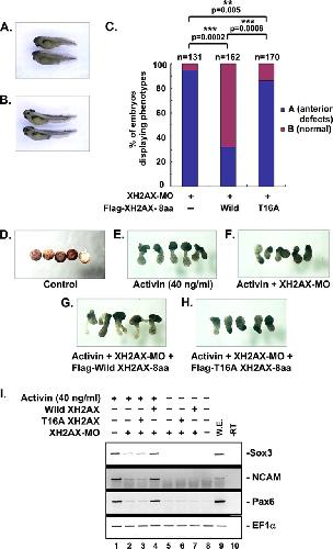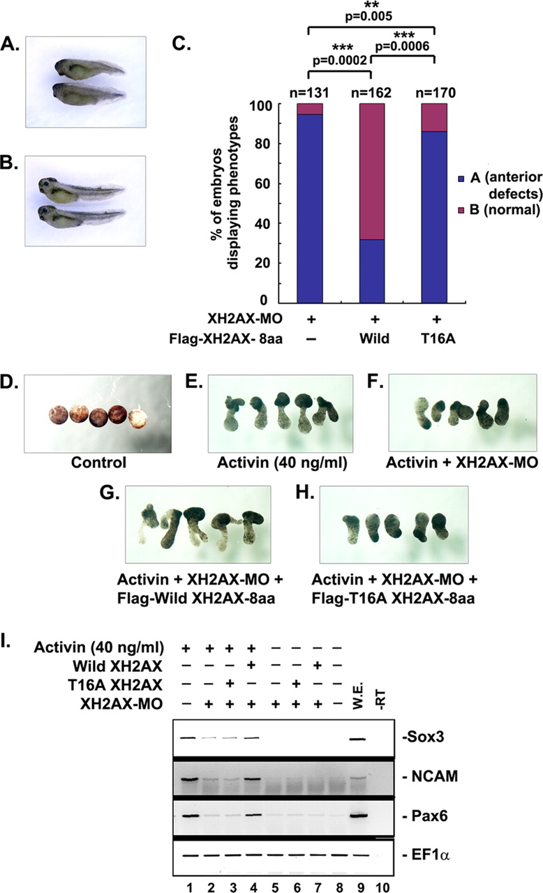 Thr16 of XH2AX has a critical role in neurogenesis. A and B, one or two-cell stage embryos injected with XH2AX-MO (30 ng) alone or in combination with 150 pg of FLAG-XH2AX-8aa or FLAG-XH2AX-T16A mRNA and cultured until the tadpole stage. A, severely defective embryo. B, fully rescued embryo. C, quantitative results of relative rescue in whole embryos shown in A and B. **, p < 0.01; ***, p < 0.001. DâI, animal caps explanted from embryos injected with XH2AX-MO (30 ng) alone or in combination with FLAG-XH2AX-8aa or FLAG-XH2AX-T16A mRNA were incubated with or without the activin protein (40 ng/ml) until stage 24. DâH, phenotype of animal cap explans. I, RT-PCR analysis of samples shown in EâH. The anterior neural marker Pax6 and the pan-neural markers N-CAM and Sox3 were used; EF1α served as a loading control. W.E., whole embryo as a positive control of PCR; âRT, control reaction without reverse transcriptase.