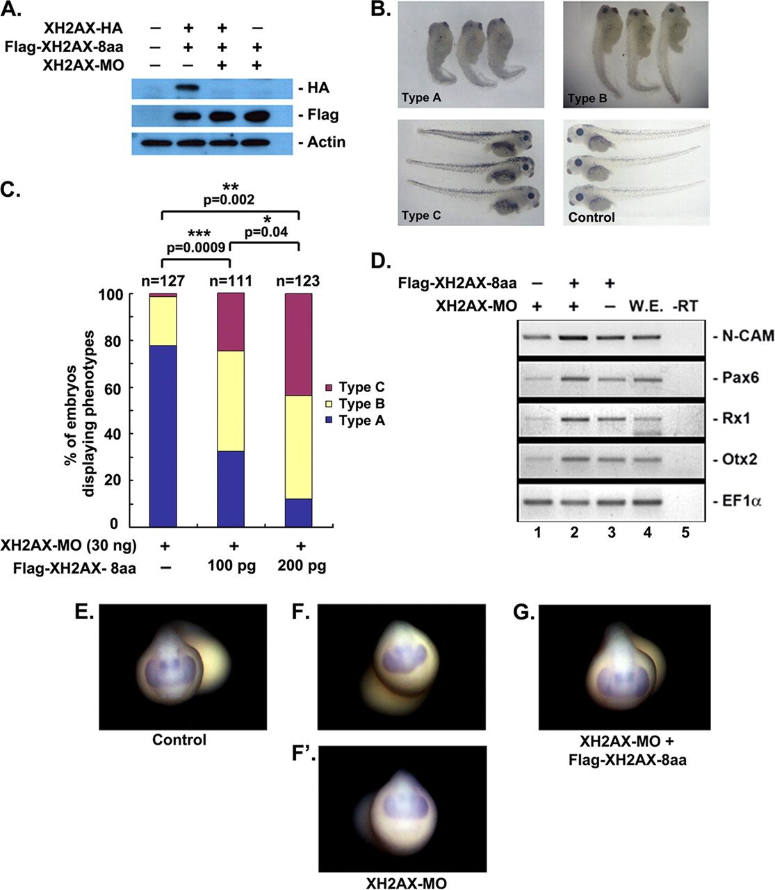XH2AX is required for anterior neural development. AâD, one- or two-cell stage embryos were injected with XH2AX-MO (30 ng) alone or in combination with the indicated dose of FLAG-XH2AX-8aa mRNA for rescue experiments. A, XH2AX-MO (30 ng) specifically knocked down the translation of the overexpressed C-terminal HA-tagged histone H2AX protein, but not the FLAG-H2AX-8aa protein, which lacks the MO target site. α-Tubulin served as a control for specificity. B, rescued phenotypes were classified into three types: Type A, severely defective embryo; Type B, moderately defective embryo; and Type C, fully rescued embryo. The control was an uninjected embryo. C, quantitative results of relative rescue in whole embryos are shown. *, p < 0.05; **, p < 0.01; ***, p < 0.001. D, RT-PCR analysis of sibling embryos: FLAG-XH2AX-8aa mRNA (150 pg) rescue of anterior neural markers (Otx2, Rx1, and Pax6) and the pan-neural marker (N-CAM) that were repressed by XH2AX-MO. W.E., whole embryo as a positive control for PCR; âRT, control reaction without reverse transcriptase. EâG, whole-mount in situ hybridizations on embryos injected as described for A with a Pax6 probe, an anterior neural marker. FLAG-XH2AX-8aa mRNA (G) rescued Pax6 expression previously repressed by XH2AX-MO (F and Fâ²). E, control-MO-injected embryo.