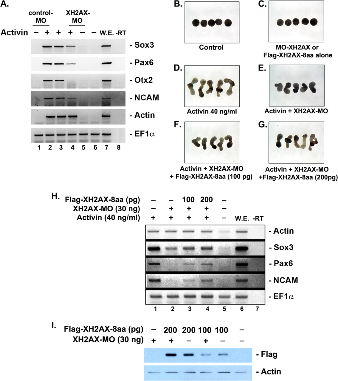 XH2AX is required for the induction of anterior neural markers by activin. AâI, animal caps, explanted from embryos injected with Control-MO or XH2AX-MO (30 ng) either alone or in combination with the indicated dose of FLAG-XH2AX-8aa mRNA, were incubated with or without the activin protein (40 ng/ml) until stage 24, anterior neural markers (Otx2, Rx1, and Pax6), pan-neural markers (N-CAM and Sox3), a mesoderm marker (actin), and EF1α as a loading control. W.E., whole embryo as a positive control for PCR; âRT, control reaction without reverse transcriptase. A, RT-PCR analysis of animal cap explants. XH2AX-MO selectively blocked the activin-induced expression of Sox3, N-CAM, Pax6, and Otx2, but not actin (lane 4). Control-MO did not change activin induction of any of the genes (lane 2). BâG, phenotype of animal caps explanted from embryos injected as described for AâI. XH2AX-MO blocked activin-induced elongation of animal caps, and this phenotype was rescued by XH2AX-8aa mRNA in a dose-dependent manner. H, RT-PCR analysis of samples shown in BâG. XH2AX-8aa mRNA injection rescued activin induction of Sox3, Pax6, N-CAM in XH2AX-MO-injected animal caps. I, Western blot of embryonic extracts probed with anti-FLAG antibody, showing that all injected constructs were translated equally when injected into Xenopus embryos. Actin served as a loading control.