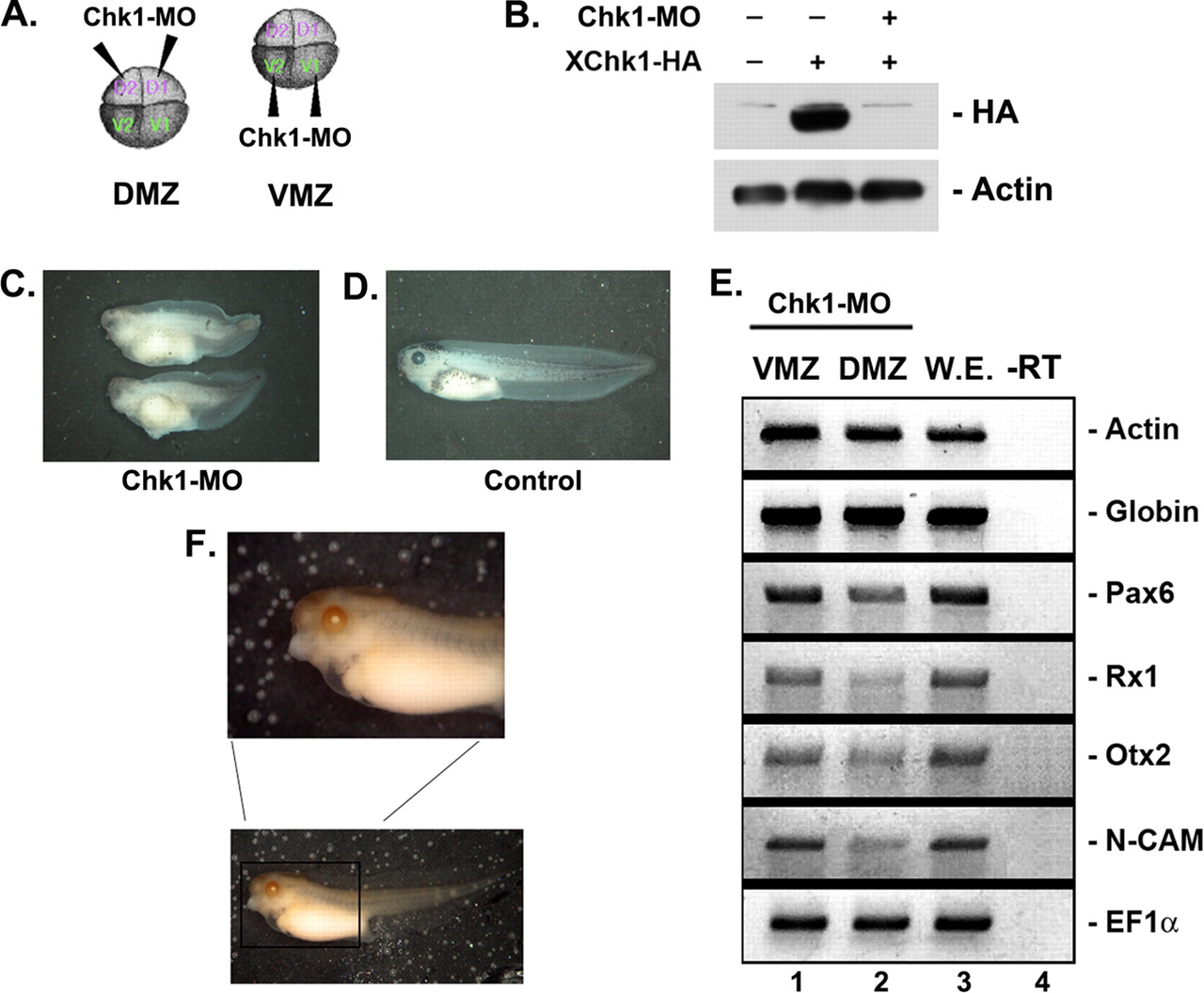 Depletion of Chk1 causes defective anterior neural formation. A, Chk1-MO (20 ng) was injected into the DMZ or VMZ of four-cell stage embryos. B, Chk1-MO specifically knocked down the translation of an overexpressed C-terminal HA-tagged Chk1 protein. Actin served as a control for specificity. C and D, dorsally injected Chk1-MO caused severe head and eye defects with a shortened axis (C) compared with the normal embryo that was not injected (D). E, RT-PCR analysis of whole embryos dorsally or ventrally expressing Chk1-MO. Dorsally (but not ventrally) expressed Chk1-MO repressed anterior neural markers (Pax6, Rx1, and Otx2) and the neural marker (N-CAM), but not the actin and globin mesoderm markers, compared with whole embryos (W.E.) not injected. EF1α served as a loading control. âRT, control reaction without reverse transcriptase. F, whole-mount in situ hybridization showing the spatial expression of Chk1 at the tadpole stage. The upper panel shows a magnified anterior region of an embryo.