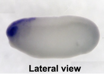 h2ax (H2A.X variant histone) gene expression in Xenopus tropicalis embryo, assayed via in situ hybridization, NF stage 24, lateral view, anterior left, dorsal up.