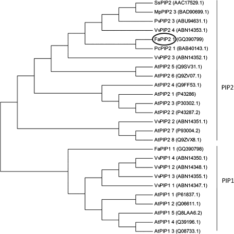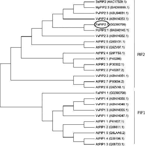 Fig. 1. Phylogenetic analysis of full-length deduced amino acid sequences of plant aquaporins, including our clones, FaPIP2;1 and FaPIP1;1. Deduced amino acid sequences from full-length plant aquaporins encoding genes from Arabidopsis thaliana, Vitis vinifera, and other plant PIP2s with high identity to FaPIP2;1 were compared using Clustal W. Phylogenetic analyses were conducted using MEGA version 4 (Tamura et al., 2007).