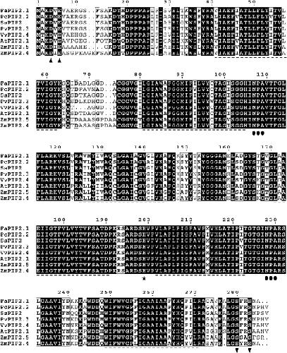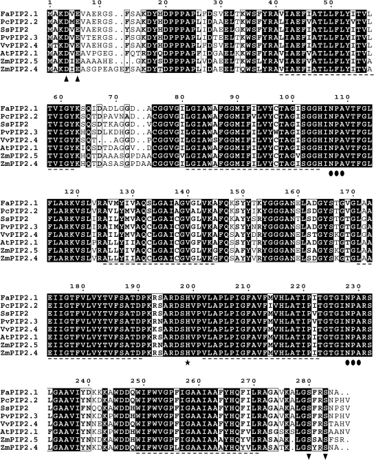 Fig. 2. Alignment of predicted amino acid sequence of Fragaria×ananassa aquaporin (FaPIP2;1) with other aquaporins (ClustalX). The predicted amino acid sequence of FaPIP2;1 was compared with aquaporins from different sources (aquaporins with the higher identity with FaPIP2;1 or very well studied in the literature). Transmembrane domains are shown with a dashed line below the alignment; triangles indicate a potential diacidic motif (putative ER signal); circles indicate the NPA selectivity filter; a star indicates His199, and inverted triangles putative phosphorylated Ser residues.