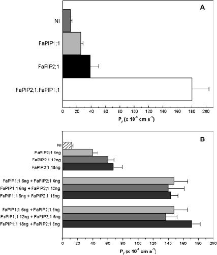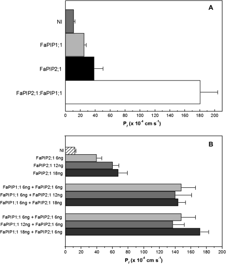 Fig. 4. Co-expression of FaPIP2;1 and FaPIP1;1. (A) Co-expression of 3 ng of cRNA of FaPIP2;1 with 12 ng of cRNA of FaPIP1;1 is shown (white bar). As a control, 3 ng of FaPIP2;1 (black bar) and 12 ng of FaPIP1;1 (light grey bar) were injected separately. The co-expression increased significantly the water permeability six times compared with the expression of FaPIP2;1 alone (p <0.05). Data are expressed as mean Pf±SEM, n=5 or 6 oocytes. NI are non-injected oocytes (grey bar). (B) Increasing cRNA mass of FaPIP2;1 injected alone in oocytes (from 6 ng to 18 ng) shows a increasing Pf. This relationship is not observed in FaPIP2;1-FaPIP1;1 co-expressing oocytes. Pf remains high but constant no matter the cRNA mass ratio injected. Data are shown as mean Pf ±SEM, n=6–8 oocytes.