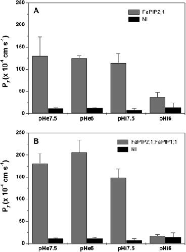 Fig. 5. Pf inhibitory response after cytosolic acidification. (A) FaPIP2;1 expressing oocytes were exposed to different external (pHe) or internal (pHi) pH conditions. Negative controls (NI) are non-injected oocytes. Pf for oocytes expressing FaPIP2;1 exposed to internal acidification is statistically different from its control (i.e. pHi=7.5), while treatment with pHe=6.0 does not result in a significant inhibition (p <0.05) when compared with its control (pHe=7.5). (B) FaPIP2;1-FaPIP1;1 was co-expressed in Xenopus oocytes and exposed to different external (pHe) or internal (pHi) pH conditions. Negative controls (NI) are non-injected oocytes. Data are shown as mean Pf±SEM, n=8–10 oocytes.