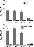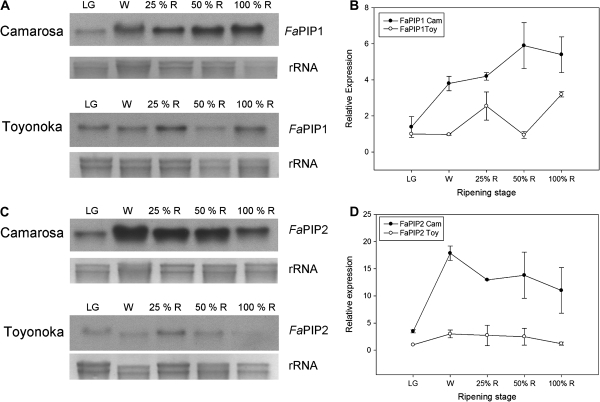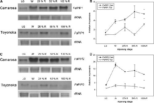 Fig. 6. FaPIP1 and FaPIP2 expression pattern during strawberry fruit ripening. (A, C). Northern blot showing the accumulation of FaPIP mRNA in different ripening stages of strawberry fruits: large green (LG), white (W), 25% red (25%R), 50% red (50%R), and 100% red (100%R) for two different cultivars, a firm (Camarosa) and a softer one (Toyonoka). (B, D) Quantification of FaPIP1 and FaPIP2 expression relative to Toyonoka LG stage is shown for Camarosa and Toyonoka cultivars (Gel Pro Analizer v 3.0 was used). Data are shown as mean ±SEM, n=2.