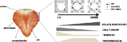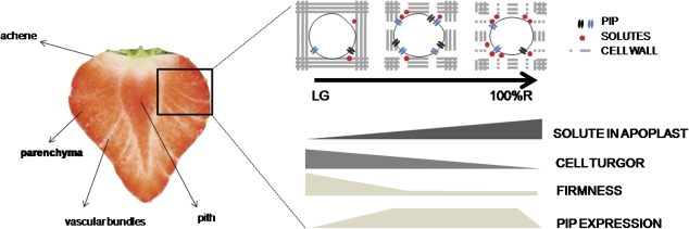 Fig. 7. Hypothetical and schematic representation of the role of aquaporins in fruit ripening. Section of a strawberry fruit showing fibrovascular strands (vascular bundles), achenes, the interior of the receptacle (pith), and main parenchyma; all marked tissues are possible targets of PIP expression due to their participation in water and solute balance in strawberry fruit.