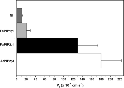 Fig. 3. Functional expression of FaPIP2;1 in Xenopus oocytes. Calculated mean water permeabilities (Pf±SEM) of oocytes under hypo-osmotic conditions for NI (non-injected, negative control) or expressing 25 ng of FaPIP1;1, FaPIP2;1, and AtPIP2;3 (used as positive control) are shown. The number of measured oocytes for each condition is 5 to 8. Pf of oocytes expressing both FaPIP2;1 and AtPIP2;3 present significant differences from negative control (p <0.05).