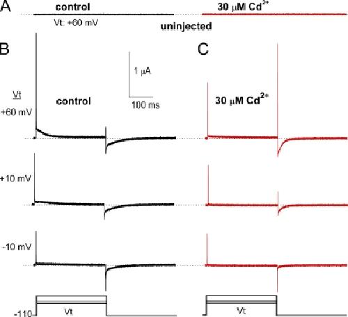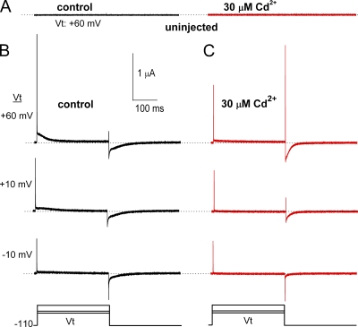 Figure 1. Effect of Cd2+ on hERG1 channel gating currents. (A) Currents recorded at a Vt of +60 mV using the COVG technique from an uninjected oocyte before (control) and 10 min after bath application of 30 µM Cd2+. Recordings were made with the same solutions used to record gating currents in oocytes expressing hERG1 channels. (B and C) Gating currents recorded at the indicated Vt before and after treatment of the same oocyte with 30 µM Cd2+. Bottom panels illustrate voltage clamp protocol used to elicit gating currents shown in panels A–C.