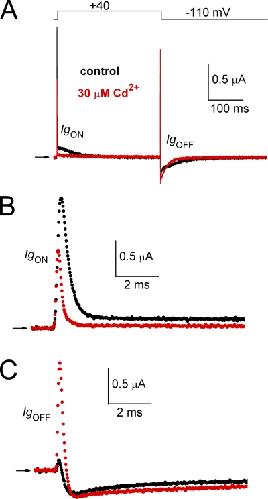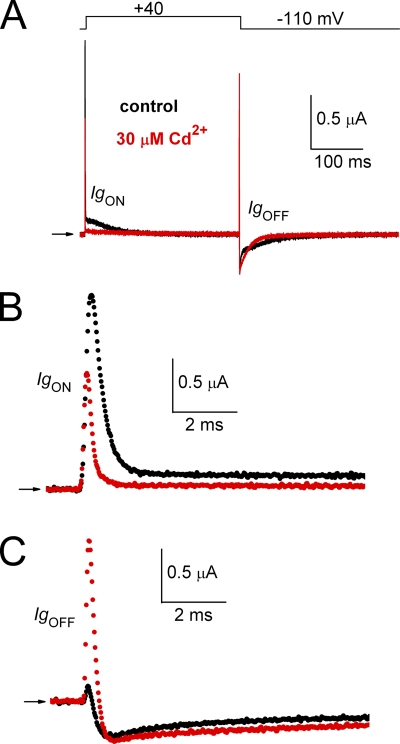 Figure 3. Cd2+ reduces the fast and slow components of IgON and induces the appearance of ICd-out, a brief initial outward component that precedes IgOFF. (A) Superimposed traces for gating currents measured before and after treatment of an oocyte with 30 µM Cd2+. Top panel shows pulse protocol. (B) IgON shown on an expanded time scale. (C) IgOFF shown on an expanded time scale.