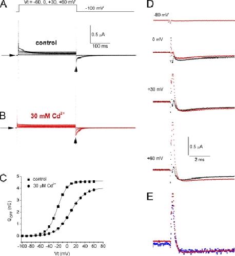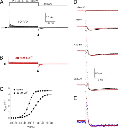 Figure 4. Gating currents measured without using p/−8 leak and capacitance current subtraction. (A) Unsubtracted currents recorded under control ionic conditions using pulse protocol illustrated in top panel. (B) Unsubtracted currents for the same oocyte in the presence of 30 µM Cd2+. (C) QOFF-V relationships for gating currents recorded in the absence and presence of 30 µM Cd2+. Data were fitted to a Boltzmann function (smooth curves). In control conditions, V1/2 = −22.1 mV and z = 2.29. In the presence of Cd2+, V1/2 = +7.8 mV and z = 1.52. (D) Superimposed traces of unsubtracted IgOFF for control (black traces) and 30 µM Cd2+ (red traces) at −110 mV after activating pulses were applied to the indicated Vt. (E) Superimposed traces for p/−8 subtracted (blue) and unsubtracted currents (red) in the presence of 30 µM Cd2+ for a Vt of +60 mV. Note that ICd-out is approximately the same, indicating that it is not an artifact of the on-line leak subtraction protocol.