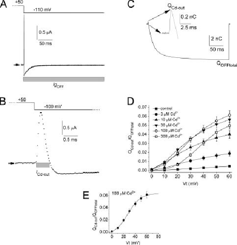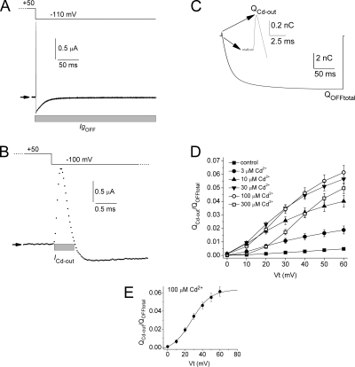 Figure 5. Effect of [Cd2+]e on the magnitude of ICd-out. (A) IgOFF in the presence of 30 µM Cd2+. Arrows indicate zero current level. Gray bar indicates region of IgOFF integrated to obtain total QOFF. (B) ICd-out shown in A, plotted on an expanded time scale. Gray bar indicates the region of IgOFF integrated to obtain QCd-out. (C) Integral of IgOFF. Inset shows QOFF at greater resolution. (D) Plot of QCd-out/QOFF total as a function of Vt and [Cd2+]e. Also shown is a plot of QCd-out versus Vt for control conditions. (E) Plot of QCd-out/QOFF total as a function of Vt for 100 µM Cd2+ and fitted to a Boltzmann function (smooth curve): V1/2 = 27 mV; slope factor = 11.0 mV; maximum value of QCd-out/QOFF total = 0.064.