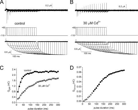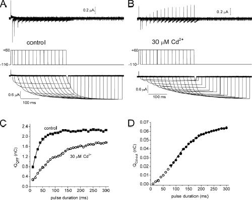 Figure 6. Kinetics of QOFF. (A) Gating currents elicited under control conditions. Top panel is a plot of gating currents in response to voltage pulse protocol shown in the middle panel. Bottom panel shows the first integral of IgOFF traces depicted in top panel. (B) Gating currents, pulse protocol, and integration of currents are shown for the same oocyte after bath application of 30 mM Cd2+. (C) Plot of total QOFF versus pulse duration determined before (filled squares) and after treatment of an oocyte with Cd2+ (open circles). Smooth curves are best fits for single-exponential function (τ = 29 ms for control; τ = 100 ms for Cd2+). (D) Plot of QCd-out in the presence of 30 µM Cd2+ versus pulse duration. Data for pulse durations >70 ms (filled circles) were fitted with a single-exponential function (τ = 95 ms). Thus, after accounting for a delay caused by overlap of the faster rising phase of IgOFF for short pulse durations, the time course of the development of QCd-out matches that of QOFF.