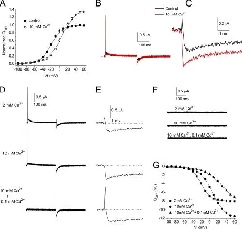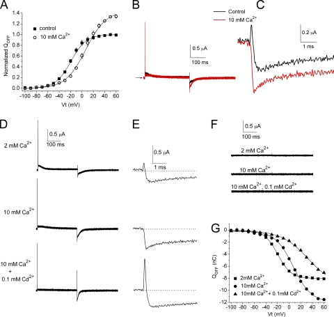 Figure 7. Elevated concentration of Ca2+ causes a positive shift in the voltage dependence of the QOFF-V relationship for hERG1, but it does not induce a transient outward component in IgOFF. (A) QOFF-V relationships for hERG1 measured under control conditions ([Ca2+]e = 2 mM) and after the elevation of [Ca2+]e to 10 mM (n = 5). Averaged data were fitted to a Boltzmann function (smooth curves). 2 mM Ca2+: V1/2 = −19.5 ± 0.5 mV and z = 1.87 ± 0.05; 10 mM Ca2+: V1/2 = 6.8 ± 1.9 mV and z = 1.42 ± 0.06. (B) Ig traces recorded in the presence of 2 mM Ca2+ (control) and 10 mM Ca2+ at a test potential of +60 mV. IgOFF was measured at −110 mV. (C) IgOFF traces from B are shown at expanded time (initial 5 ms) and amplitude scales. (D) Gating currents of WT hERG1 channels measured during 300-ms pulses to +40 mV with a holding and return potential of −110 mV. QOFF-V relationships are shown in G. Extracellular concentrations of Ca2+ and Cd2+ are indicated to the left of the current traces. (E) Expanded view of initial IgOFF for the traces shown in D. (F) Currents recorded from an uninjected oocyte using the same pulse protocol as in D with the indicated concentrations of extracellular divalent cations. (G) QOFF-V relationship determined in a single oocyte in the presence of the indicated concentrations of extracellular Ca2+ and Cd2+. For 2 mM Ca2+: QOFF-max = −8.0 nC, V1/2 = −19.6 mV, and z = 2.2. For 10 mM Ca2+: QOFF-max = −12.0 nC, V1/2 = +7.3 mV, and z = 1.6. For 10 mM Ca2+ + 0.1 mM Cd2+: QOFF-max = −9.3 nC, V1/2 = +32 mV, and z = 1.1.