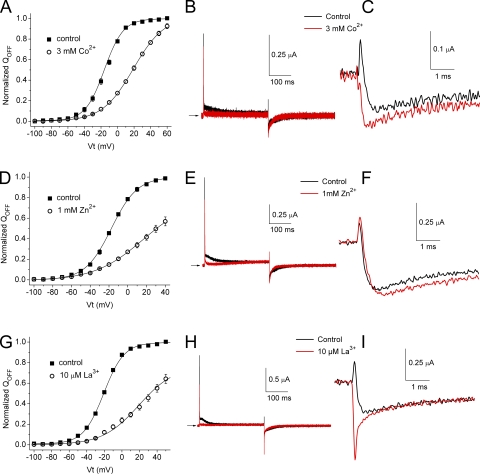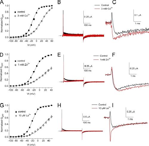 Figure 8. Co2+, Zn2+, and La3+ cause a positive shift in the voltage dependence of QOFF-V relationships for hERG1, but they do not induce a transient outward component in IgOFF. (A) QOFF-V relationships for hERG1 measured under control conditions ([Ca2+]e = 2 mM) and after the addition of 3 mM Co2+ (n = 3). Control: V1/2 = −15.9 ± 0.8 mV and z = 2.20 ± 0.08; Co2+: V1/2 = 19.1 ± 0.9 mV and z = 1.34 ± 0.02. (B) Ig traces recorded in the presence of 2 mM Ca2+ (control) and 3 mM Co2+ at a test potential of +60 mV. IgOFF was measured at −110 mV. (C) IgOFF traces from B are shown at expanded time (initial 5 ms) and amplitude scales. (D) QOFF-V relationships for hERG1 measured under control conditions ([Ca2+]e = 2 mM) and after the addition of 1 mM Zn2+ (n = 3). Control: V1/2 = −17.5 ± 0.3 mV and z = 1.82 ± 0.03; Zn2+: V1/2 = 16.4 ± 6.3 mV and z = 0.97 ± 0.06. (E) Ig traces recorded in the presence of 2 mM Ca2+ (control) and 1 mM Zn2+ at a test potential of +60 mV. IgOFF was measured at −110 mV. (F) IgOFF traces from E are shown at expanded time (initial 5 ms) and amplitude scales. (G) QOFF-V relationships for hERG1 measured under control conditions ([Ca2+]e = 2 mM) and after the addition of 10 µM La3+ (n = 3). Control: V1/2 = −20.6 ± 0.4 mV and z = 2.18 ± 0.06; La3+: V1/2 = 19.3 ± 3.9 mV and z = 1.23 ± 0.08. (H) Ig traces recorded in the presence of 2 mM Ca2+ (control) and 10 µM La3+ at a test potential of +60 mV. IgOFF was measured at −110 mV. (I) IgOFF traces from H are shown at expanded time (initial 5 ms) and amplitude scales.