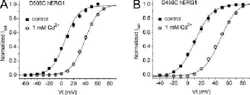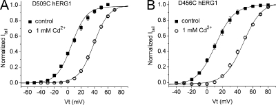 Figure 9. Extracellular Cd2+ induces positive shifts in the G-V relationships of D509C and D456C hERG1 channels. (A and B) G-V relationships for D509C hERG1 (A; n = 6) and D456C hERG1 (B; n = 5) channel currents in the absence (control) and presence of 1 mM extracellular Cd2+.