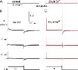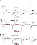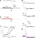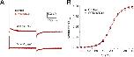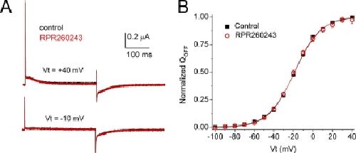 Figure 11. RPR260243 has no effect on hERG1 channel gating currents. (A) Gating currents for WT hERG1 channels measured at test potentials of −10 and +40 mV before (black traces) or 25 min after exposure of an oocyte to 30 µM RPR260243 (red traces). For these experiments, the currents were filtered at 5 kHz and digitized at 20 kHz. (B) Average QOFF-V relationships determined under control conditions and after the treatment of the same oocytes with 30 µM RPR260243 for 20–25 min (n = 5). QOFF was normalized to the peak of the control value for each oocyte. Data were fitted with a Boltzmann function (smooth curves). In control conditions, V1/2 = −18.6 ± 0.5 mV and z = 1.84 ± 0.01. In the presence of RPR260243, V1/2 = −19.0 ± 0.5 mV and z = 1.88 ± 0.01.