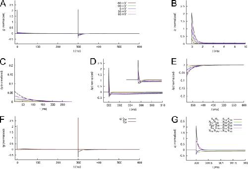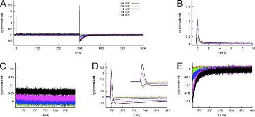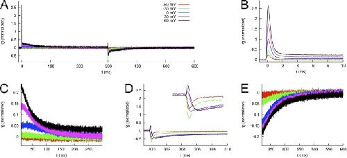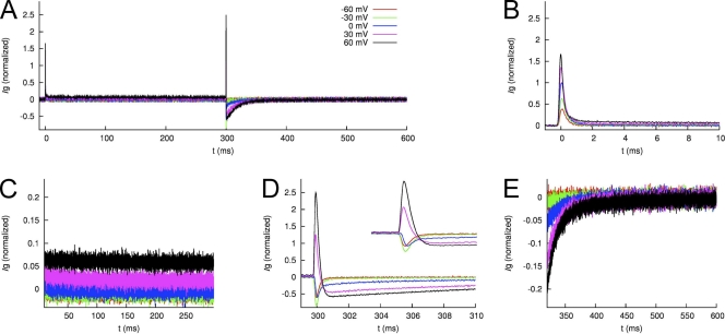 Figure 12. Averaged and normalized Ig of WT hERG1 channels measured using p/−8 leak and capacitance current subtraction. (A) Ig in response to test voltages Vt of −60, −30, …+60 mV during 0–300 ms. The membrane voltage is clamped to −110 mV otherwise. (B and C) IgON at 0–10 ms and 10–300 ms, respectively. (D and E) IgOFF at 300–310 ms and 310–600 ms, respectively.
