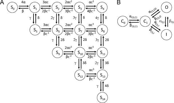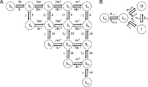 Figure 13. Schematics of Markov model for gating and ionic currents of WT hERG1 channels. The model consists of two components, one for voltage sensing with the states S0 to S14 (A) and the other for activation and inactivation with the states C0, C1, O, and I (B). The coupling between the components is via the rate coefficient αC0,C1, which is a function of the states S4, S8, S11, S13, and S14 in the component for voltage sensing.