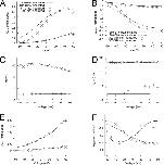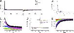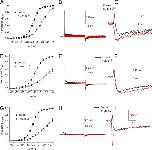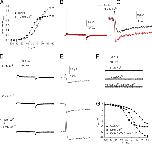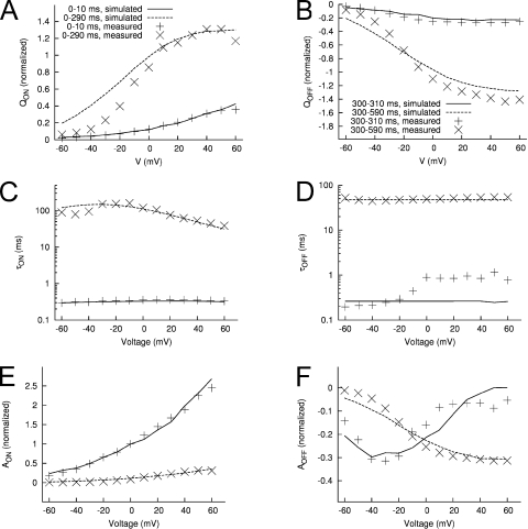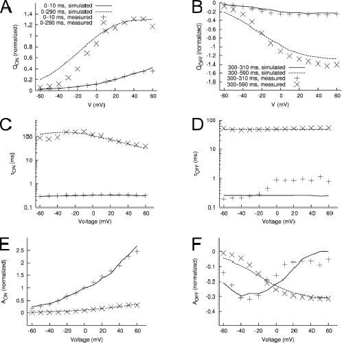 Figure 14. Features of measured and modeled Ig. Q-Vt relationships for IgON (A) and IgOFF (B). Time constants–Vt relationships for IgON (C) and IgOFF (D). Relationship of exponential fit coefficients to Vt for IgON (E) and IgOFF (F).