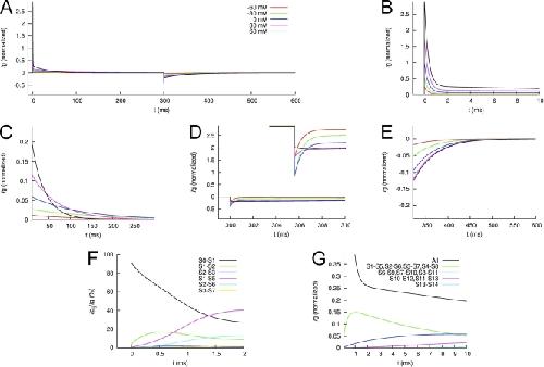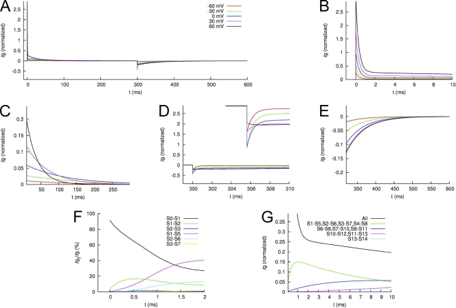 Figure 15. Modeled Ig of WT hERG1 channels. (A) Ig in response to the voltage-clamping protocol used in Fig. 12. (B and C) IgON at 0–10 ms and 10–300 ms, respectively. (D and E) IgOFF at 300–310 ms and 310–600 ms, respectively. (F) The initial phase (0–1 ms) of IgON is primarily carried by the fast transition between S0 and S1. (G) The slow decay of IgON between 2 and 10 ms is caused by a mixture of increasing and decreasing gating currents associated with the slow transitions in the gating model.