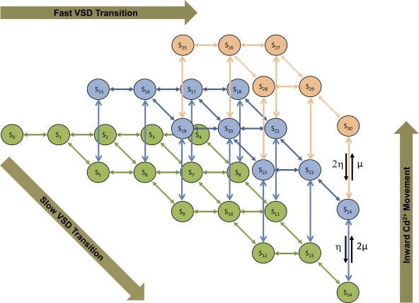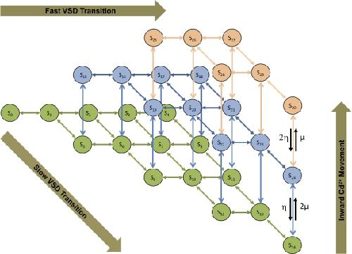 Figure 17. Schematics of Markov model for Ig of WT hERG1 channels in the presence of extracellular Cd2+. The model extends the description of Ig in Fig. 13 A with states and transitions describing the movement of Cd2+. States S0 to S14 (green) describe hERG1 configurations with Cd2+ bound to a site in the VSD. States S15 to S24 (blue), and S25 to S30 (brown), are associated with hERG1 configurations having one and two Cd2+ ions moved in the VSD, respectively.