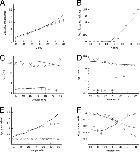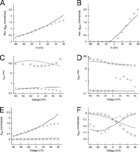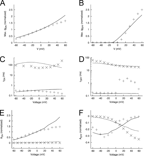 Figure 18. Features of measured and modeled Ig in the presence of extracellular Cd2+. (A) Maximal IgON-Vt relationship. (B) Maximal IgOFF-Vt relationship. Time constants–Vt relationships for IgON (C) and IgOFF (D). Relationship of exponential fit coefficients to Vt for IgON (E) and IgOFF (F).