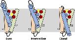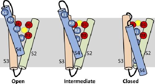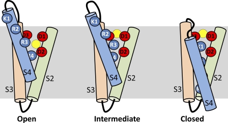 Figure 20. Schematic showing state-dependent positions of Cd2+ and key charged residues in S2–S4 segments of the VSD of a single hERG1 channel subunit. According to this model, Cd2+ is displaced in an outward direction by basic residues in the S4 segment as it moves inward in response to membrane repolarization. (Left) VSD at depolarized potentials and Cd2+ in its “depolarized” coordination site. (Right) VSD at a negative transmembrane potential when all channels are closed and Cd2+ located in a position defined as the “repolarized” coordination site. (Middle) A putative intermediate state of the channel. K1, K525; R2, R528; R3, R531; R4, R534; D1, D456; D2, D460; D3, D509. The yellow circle represents a Cd2+ ion.