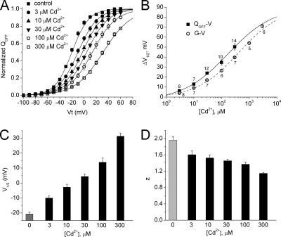 Figure 2. Extracellular Cd2+ shifts the Q-V relationship for hERG1 to more positive potentials. (A) Normalized QOFF is plotted as a function of Vt and [Cd2+]e. Averaged data for control and each [Cd2+]e were fitted to a Boltzmann function (smooth curves). (B) Plot of change in V1/2 for Q-V and G-V relationships as a function of [Cd2+]e. Data were fitted to a Hill equation to determine EC50 and Hill coefficient (nH). ΔV1/2max was set at +90 mV (Fernandez et al., 2005). For Q-V relationship, EC50 = 171 ± 13 µM; nH = 0.53 ± 0.03. For G-V relationship, EC50 = 416 ± 20 µM; nH = 0.57 ± 0.02. The number of oocytes used to calculate the average data is indicated next to each data point. (C) [Cd2+]e-dependent effects on V1/2 for Q-V relationship. (D) [Cd2+]e-dependent effects on effective valence, z, of Boltzmann function for Q-V relationship. For A, C, and D, the number of oocytes was as follows: control, 20; 3 µM Cd2+ , 8; 10 µM Cd2+, 7; 30 µM Cd2+, 12; 100 µM Cd2+, 10; 300 µM Cd2+, 14.