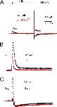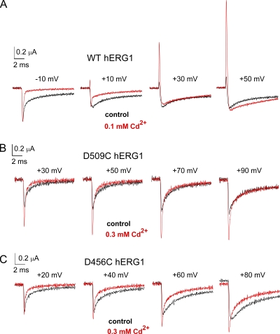Figure 10. Cd2+ enhances ICd-out of WT but not D509C or D456C hERG1 channels. (A) Traces for initial 10 ms of IgOFF of WT hERG1 channels elicited by return of membrane potential to −110 mV from the indicated Vt. (B and C) Traces for initial 10 ms of IgOFF of D509C (B) or D456C hERG1 (C) hERG1 channels elicited by return of membrane potential to −110 mV from the indicated Vt. Current traces for mutant channels are aligned below the traces for WT channels to facilitate comparisons based on measured shifts in the V1/2 for activation of ionic currents. For all panels, black traces represent control currents, and red traces represent currents after treatment of an oocyte with 0.1 mM (WT channels) or 0.3 mM (mutant channels) CdCl2.
